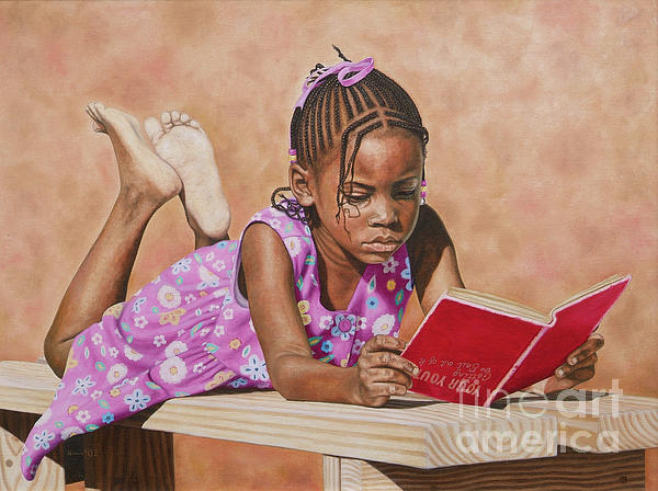 Little girl trying to read a grown for youth.